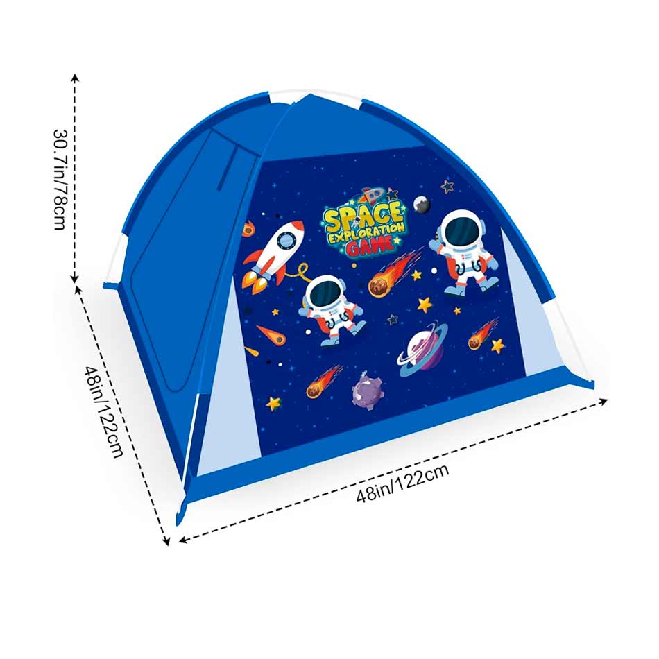 -Diseñada como un mini campamento espacial, esta tienda de campaña está decorada con coloridos astronautas, planetas, meteoritos y cohetes.