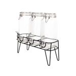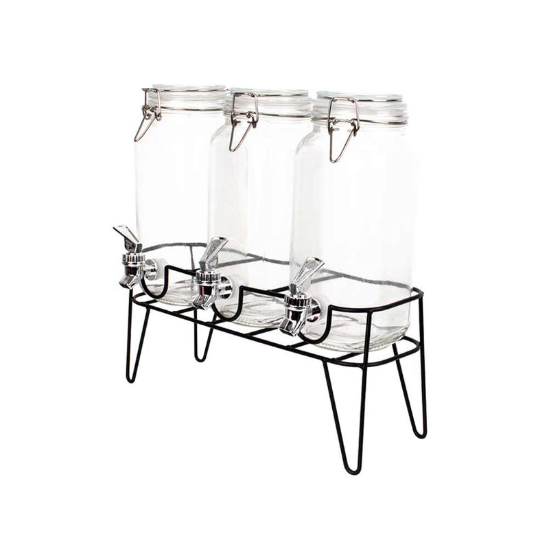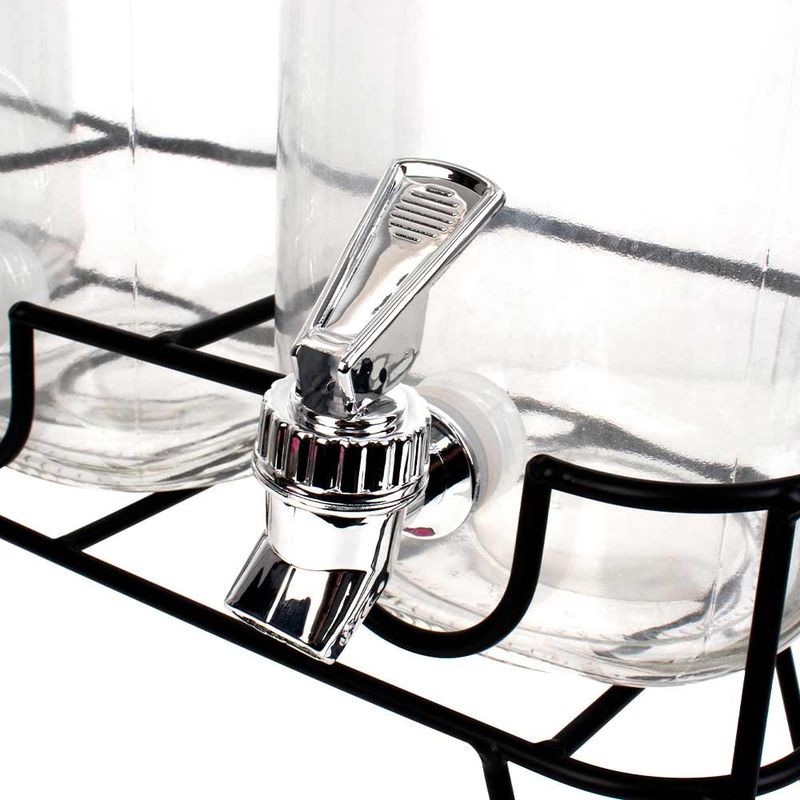 Dispensador de bebidas de vidrio con soporte está diseñado para ser una característica llamativa Capacidad2 litros cada uno MaterialVidrio con base metalicaTapa de vidrio HermeticaIncluye llaveMedidas Empaque13cm ancho x 33cm alto x 38cm largoMedidas producto26cm alto x 11cm anchoGenial para fiestas