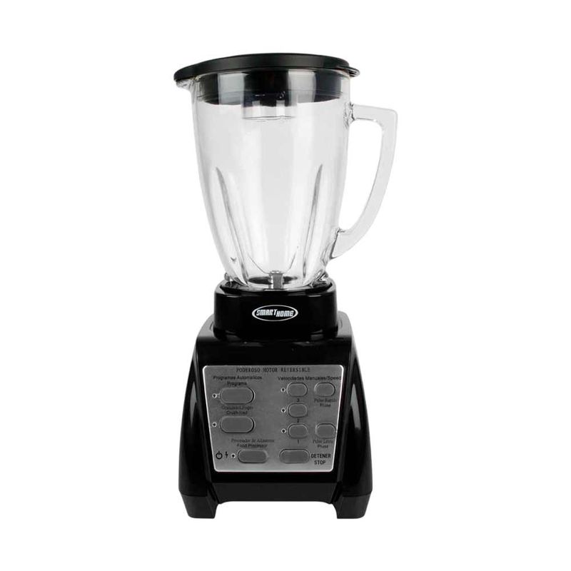 La licuadora Smart Home de 550W con jarra de vidrio de 1.25 litros es una opción práctica.Su vaso de vidrio redondo ofrece mayor resistencia y fácil limpieza.Sus cuchillas de acero inoxidable permiten un triturado eficaz incluso de hielo.Cuenta con control de temperatura y tapa medidora removible brindando mayor precisión en cada preparación.Medidas 37cm alto x 18cm largo x 16cm ancho.