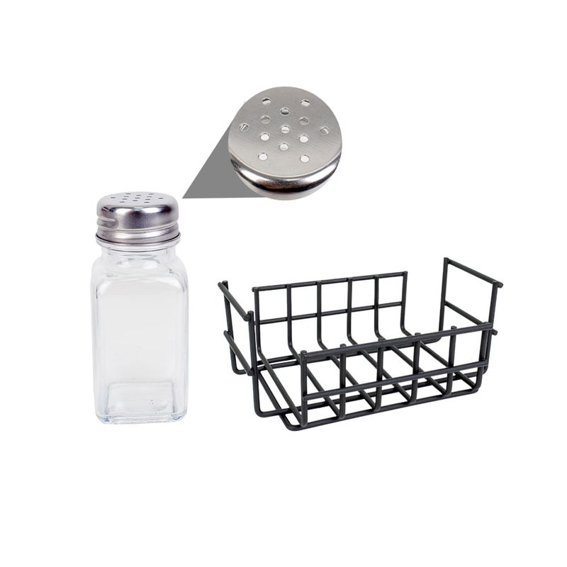 -Incluye frascos de vidrio con tapas perforadas que permiten dosificar fácilmente sal, pimienta y especias en polvo.