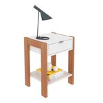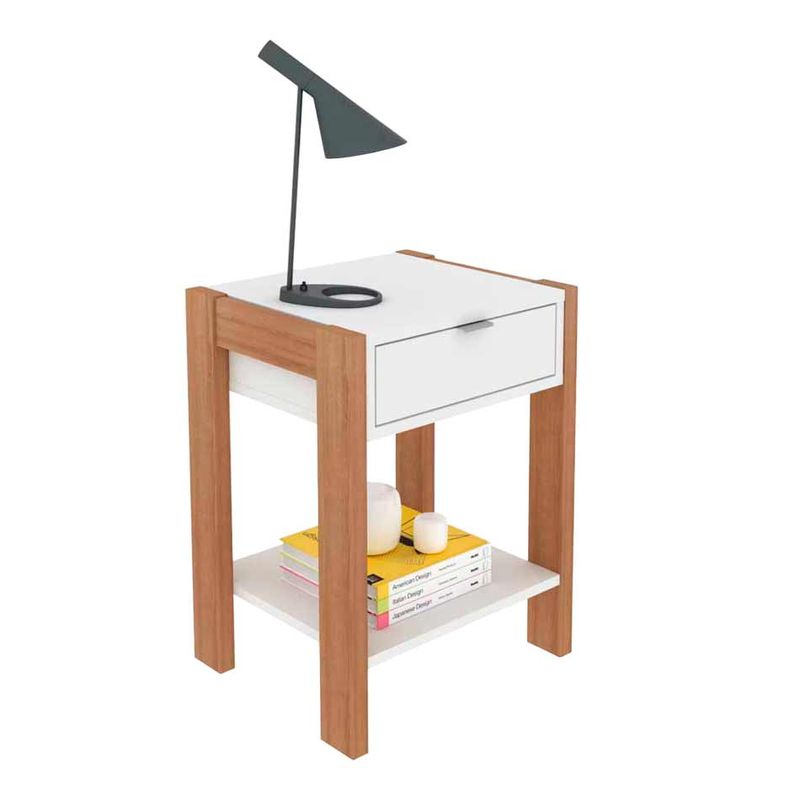 Dale un toque moderno y funcional a tu dormitorio con esta mesa de noche.Incluye 1 cajón para guardar accesorios personales y una repisa inferior.Material Madera Densidad Media.Medidas 35.5cm largo x 54.5cm alto x 41cm ancho.Ideal como velador mesa lateral o mesa auxiliar para sala y dormitorio.